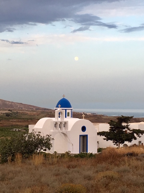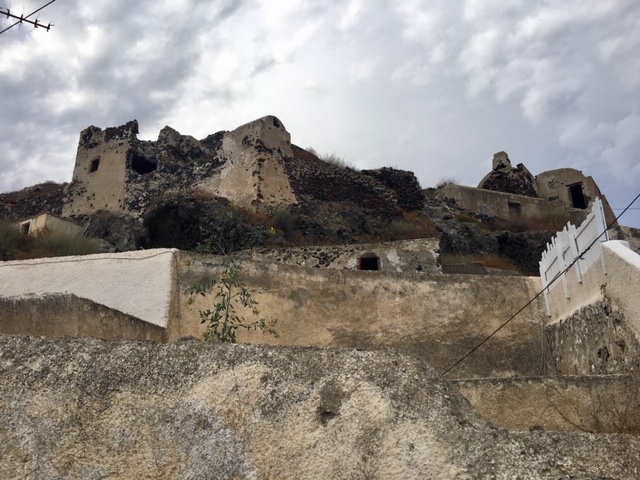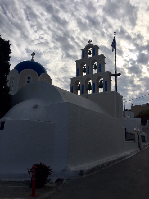 After soaking in the cool ocean and warm sun, I headed into the actual town of Akrotiri. There are the remains of a small castle not too far from a quaint church with a blue roof and bronze bells. As you’ll discover, not all of Santorini’s buildings are blue, just the churches.