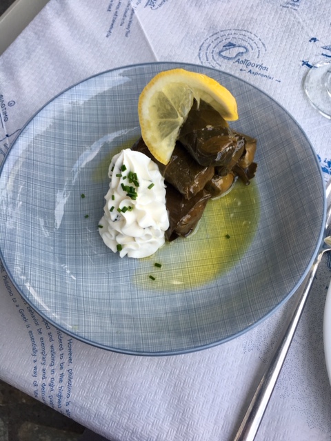 For my first course, I had stuffed grape leaves served with yogurt, herbs, lemon, and olive oil. All the ingredients are grown on Santorini and you can taste it in the cooking. The grape leaves were so fresh, light, and tender.
