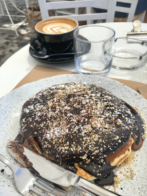But the best place in Fira is Volkan on the Rocks. It’s a bit of a hike, but that’s why it’ll be less crowded than Enigma, which is in a busier area. It has the most gorgeous view and a delicious menu. You can choose from lighter dishes like homemade yogurt and granola, which is a lovely way to start the day. Or you can go for these praline pancakes smothered in Nutella. You already know I chose the latter.